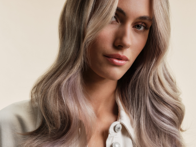 For the Polychrome Pearl look, brightness is prepped with BLONDME Premium Lightener 9+ and 2% | 7 Vol. for a clean, even lift. A soft, natural root shadow is created using BLONDME Glow Toner Glossed Cedar 7-01, followed by cool, luminous slices toned with Lavender 9.5–91 + Steel 9–21. The overall blend is refined with BLONDME Glow Toner Ice 10-1, while the face frame is finished with Pearl Glaze 10-01 for a radiant, pearlescent glow.